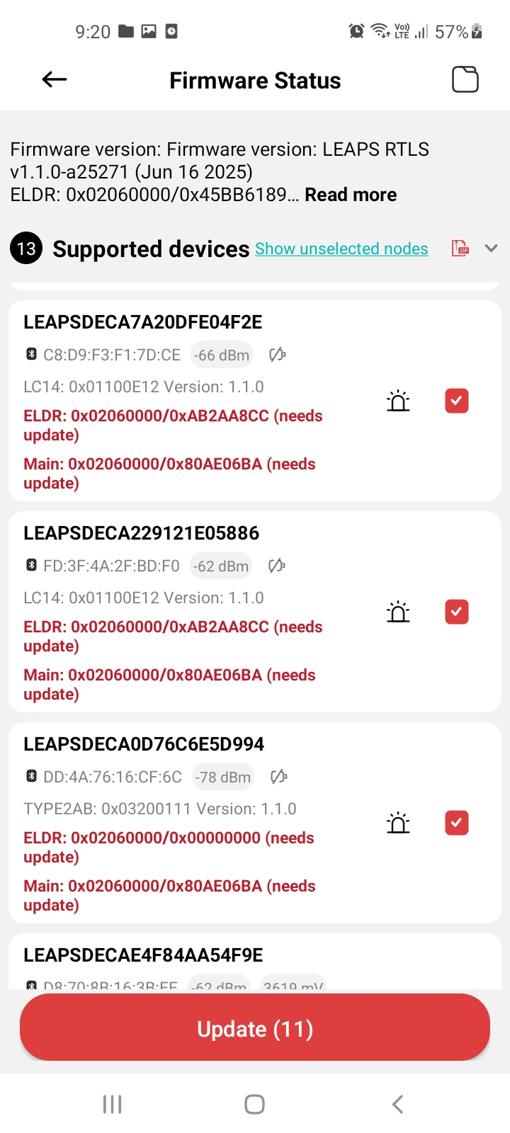 Open the LM and navigate to the Demo Selector. Additionally, you can navigate to the created network to update the devices in the network. Access firmware status. Tap the options menu (represented as three vertical dots) within the application. Look for the Firmware status option and select it.
